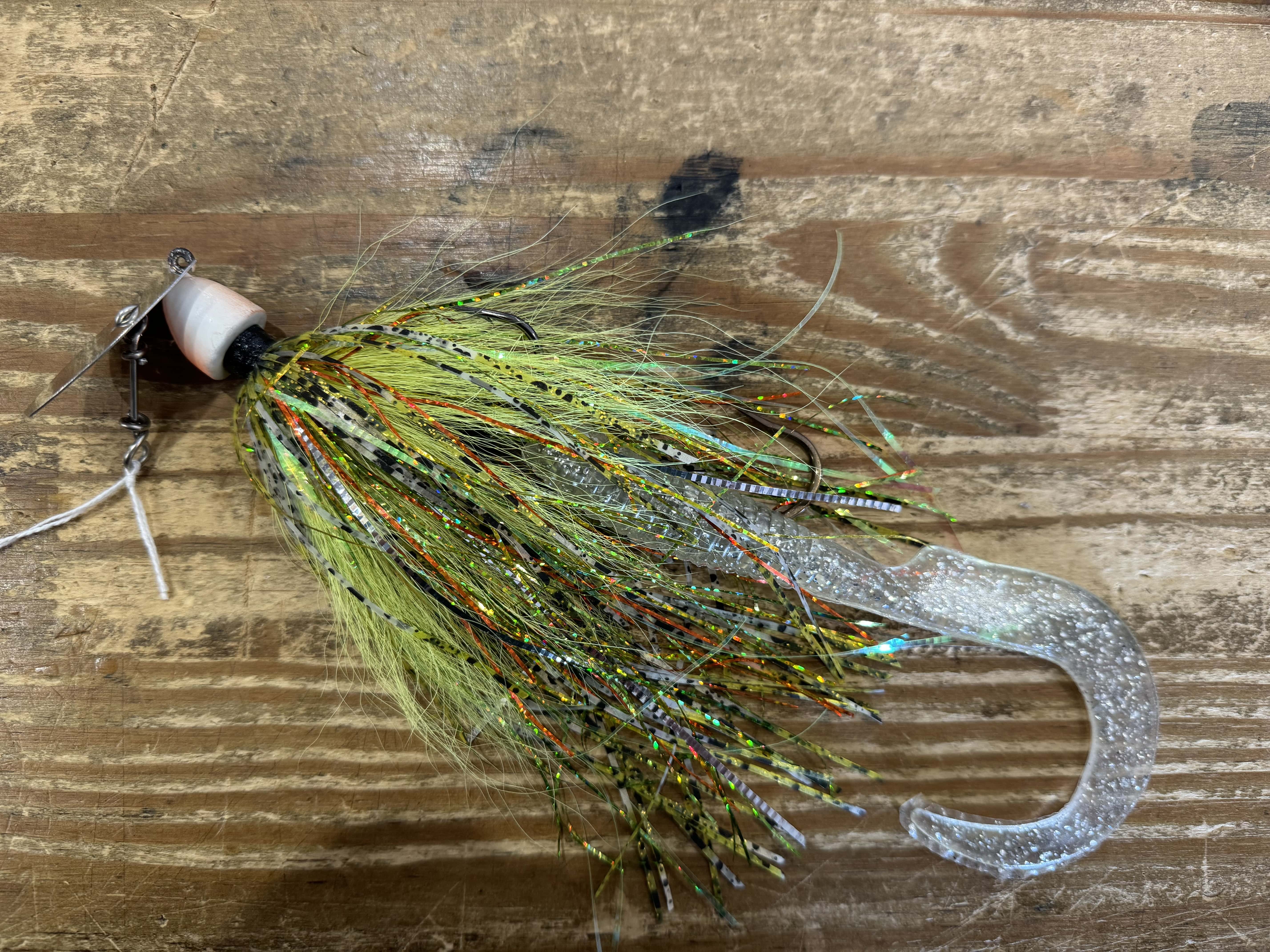 Gemaakt van rubber/siliconen skirts, tinsel bucktail en een 6" twister als trailer.