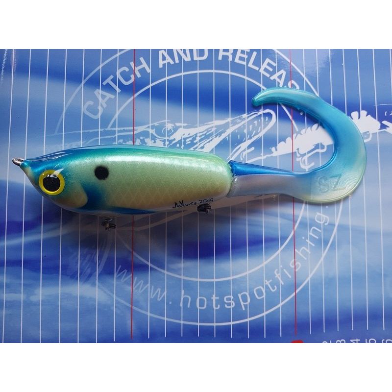 De body van de Wideboy is 11 cm lang, totaal 25 cm, weegt ongeveer 90 gram en is langzaam zinkend. Een tailbait zo compact is een echt werpkanon die ook met sterke wind goed te werpen is.