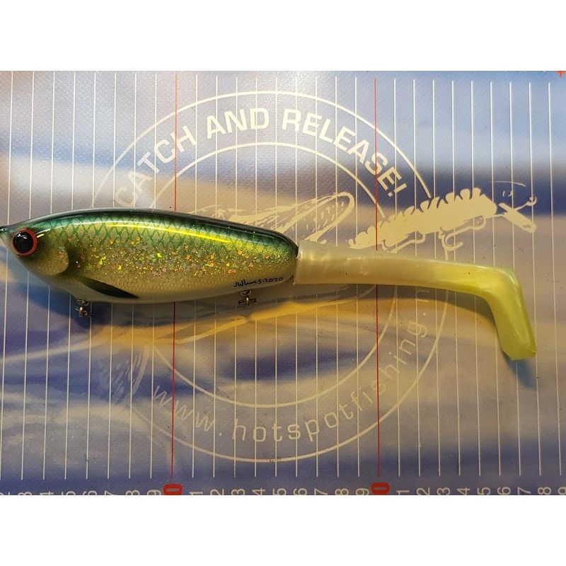 Dit kunstaas is 135mm lang (met staart 250mm) en weegt zo’n 135 gram. Langzaam zinkende tailbait die van 50 cm tot 150 cm diep z’n werk doet. Je kan er natuurlijk allerlei andere staarten achter monteren
